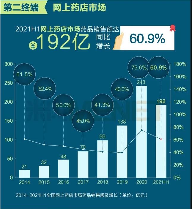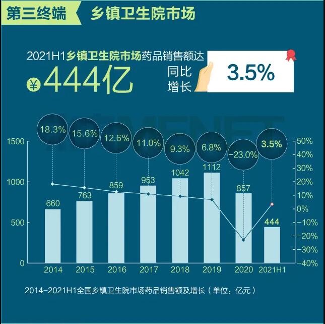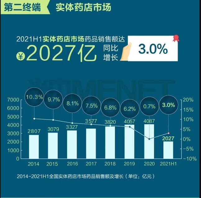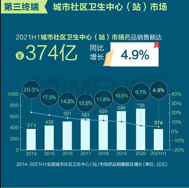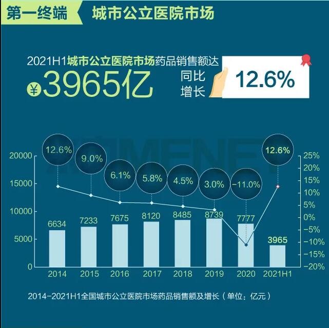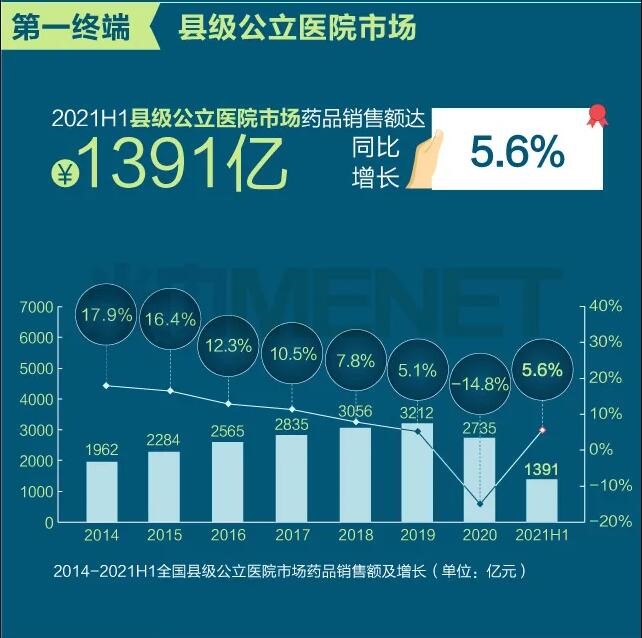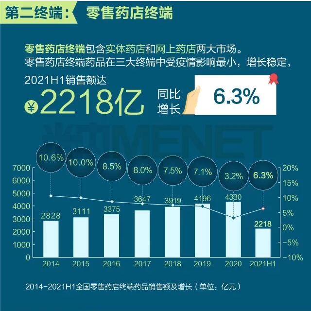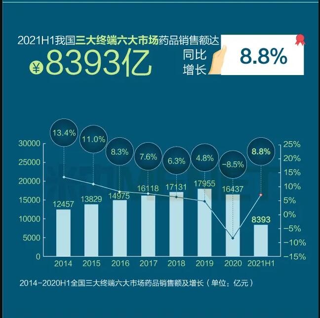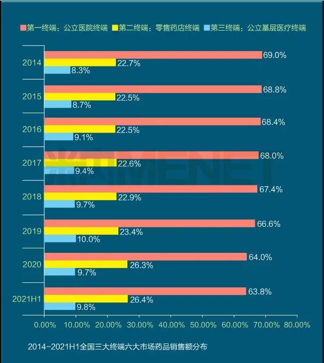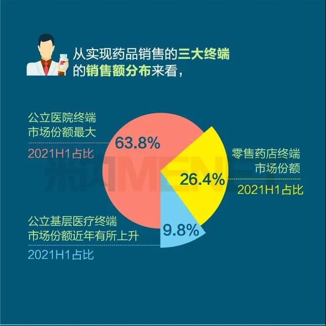 2021年上半年我國三大終端六大市場(定義范圍詳見文末“數據說明”)藥品銷售額達8393億元,同比增長8.8%。從實現藥品銷售的三大終端的銷售額分布來看,公立醫院終端市場份額最大,2021上半年占比為63.8%;零售藥店終端市場份額2021上半年占比為26.4%;公立基層醫療終端市場份額2021上半年占比為9.8%。以上統計數據未包含“民營醫院、私人診所、村衛生室”。